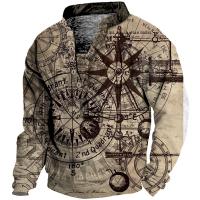Amazon Men's Long Sleeved Hoodies In Europe And America, 3D Digital Printing, Retro Style Standing Collar, V-neck, Henry Neck, Long Sleeved Men's